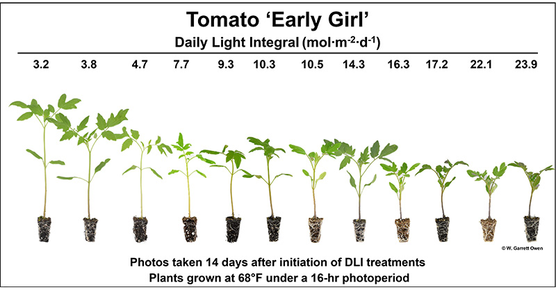 Vegetable transplants can be produced year-round for controlled-environment production; however, spring is the most popular season for greenhouse growers to produce vegetable transplants destined for retail garden centers and field production. During early-spring months, ambient outdoor daily light integrals (DLIs) can range from 5 to 25 mol·m–2·d–1 for most of the United States. Light transmission into the greenhouse can be reduced by 60% or more from the glazing material or shading from infrastructure, overhead equipment, and hanging baskets. Under low DLIs, germination will be uneven or delayed thus increasing production time. Furthermore, young transplants (plugs) will exhibit poor root growth with stretched, weak hypocotyls that can be easily broken while handling or transplanting. The optimal DLI range for vegetable transplant production is 10 to 15 mol·m–2·d–1. Maintaining an optimal DLI reduces production time and yields high-quality transplants that are compact with short, thick hypocotyls, smaller leaves, and are well rooted. Additionally, these transplants are less likely to be damaged when handled. To improve transplant quality and increase DLI under light limiting conditions, growers can implement a lighting strategy that manipulates light quantity (intensity) and duration (photoperiod) such as supplemental day-extension lighting. However, this may not be feasible for all. Keeping the glazing material clean, limiting overhead obstructions, retracting shade curtains, or removing whitewash or hanging baskets suspended above the transplants are some light management strategies that can increase light transmission into the propagation and/or growing environments.